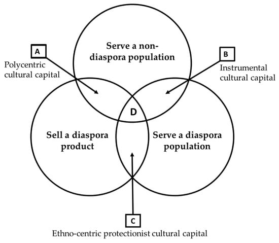 Our proposed concept of total diaspora cultural capital is closely associated with the community development and sustainability initiatives, where it is argued that ultimate sustainability depends on the development of all forms of capital, including natural, social, human, cultural and political capital. It is, therefore, significant to explore the elements of each type of capital to enhance the overall contribution towards societal and economic development. In this sense, we define diaspora cultural capital by connecting diaspora products and diaspora people with the wider (non-diaspora) community (Figure 2). Our notion of total diaspora cultural capital is rooted in the sociology of Durkheim, who coined the notion of collective conscience which is made up of the communal beliefs, morals and attitudes of a society. This collective conscience, which gives rise to total diaspora cultural capital, comprises the dynamic forces deriving from the meeting of various subcultures, i.e., from the host and the diaspora communities. Total diaspora cultural capital then is the result of a high level of dynamic cultural integration. This perspective also assists in the redefinition of the nature and scope of diaspora businesses and socio-economic activities in the Western context.