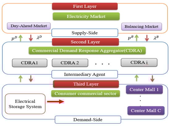 The dynamic electricity market is modeled in the first layer of the newly introduced multilayer structure. This study aims to understand the short-term and 24 h in advance to nearly real-time flexibility of commercial shopping centers in a power system with a high level of renewable energy penetration. An electricity market with multiple classes is considered to safeguard the system from the fluctuation of renewable energy. Two trading classes, day-ahead and balancing markets, are available in the electricity market. CDRAs embedded in the second layer are the first-layer participants. One of the most efficient energy markets, the day-ahead market, settles 24 h before the delivery of electricity. Participants in the market, such as CDRAs, trade in this class of contracts based on the anticipated intermittent capacity of renewable resources for the next 24 h. At this stage, CDRAs expend the majority of their energy on planning. As the moment of the delivery of electricity draws near, uncertainties relating to renewable energies become progressively less significant.