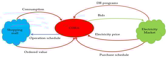 Figure 2 describes the transfer of information from one agent to another to show the interaction between different agents sending data. Based on the figure, the electricity market is located on the supply side, and the responsive consumers, i.e., shopping centers, are situated on the demand side. The DRAs, including CDRAs, are intermediaries between supply and demand. Firstly, on the demand side, the DRAs receive energy consumption data from the contracted consumers. The main duty of the DRAs is to optimize the operation of the consumers to achieve two main aims: (1) provide power flexibility to the power system through DR programs and (2) optimize the energy consumption of the consumers.