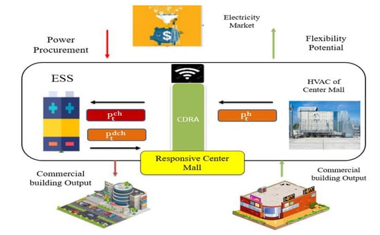 Due to the increase in intermittency and fluctuation on the supply side and the rise in electricity consumption on the demand side, new types of flexibility are required to maintain the current power systems. Therefore, the demand side must be flexible to ensure a power system’s flexibility [9]. Actors on both the production and consumption sides can exploit power systems as load-responsive applications grow. One of the apparent requirements is reviewing and changing the operation and scheduling models of power systems due to the growing involvement of consumers in exploitation and scheduling [10]. Shopping center buildings are of particular interest to the commercial sector because they have HVAC (heating, ventilation, and air conditioning) systems that are flexible enough to implement the demand response (DR) process [11]. Commercial building HVAC systems operating as DR sources offer several significant benefits. HVAC systems use about 37% of all the electricity used in commercial buildings. This amount met more than 13% of the country’s electricity demand in 2017 [12]. Advances in building energy management systems (BEMS) and variable speed drives (VSDs), in particular, have enhanced HVAC systems’ control technology [13]. The direct HVAC control approach was used in [13,14]. The direct control method changes the reference power input to keep the indoor temperature within a reasonable range. The reference power input of the VSD is roughly equal to the power input of the HVAC system, which accounts for its quick response time. Additionally, HVAC systems are necessary for commercial buildings and do not require the installation of additional hardware. The DR of HVAC systems has been the subject of some studies. DR studies can be categorized as (1) studies on the control of DR resources as price receivers and (2) studies on optimal pricing for implementing DR. For instance, the cost of electricity was predetermined in [14,15]. The building operator scheduled the HVAC systems’ ideal power consumption profiles [15] to reduce the overall cost of operation. Ref. [16] proposed a pricing strategy to help Electric Utility Companies (EUCs) and building operators achieve an optimal DR of price-elastic HVAC systems while considering peak load reduction. Retail prices for distribution network operations were best determined [17] with respect to DR services in HVAC systems. Ref. [18] discussed the optimal operation and scheduling of commercial air-conditioning systems by considering the DR required for maximum benefit. The paper collected the operating data of chiller units used by commercial users, calculated the cooling load of each unit, and derived the relationship between the cooling loads and power consumption of each unit. Ref. [19] proposed a DR framework to plan the daily operation of an air-conditioning system to minimize energy costs and guarantee thermal comfort. The framework included an electrically analogous thermal model and the formulation of an energy optimization problem with thermal and electrical constraints. Ref. [20] presented a complete model of a commercial building HVAC system consisting of a chiller, a water pump, and multiple AHUs (Air Handling Units) and developed a two-level control system to follow five-minute energy market signals and four-second frequency regulation signals. The first-level coarse control system provided commands for both water and air loop variables. The second-level fine control system adjusted the fan commands while maintaining the water loop inputs within the five-minute control period. As a result, the water loop power served as a basis for tracking energy market signals, and the air loop fan control system could be adjusted flexibly for frequency regulation. The authors of [21] focused on aggregating and scheduling multi-chiller HVAC systems in terms of continuous time stochastic unit commitment. The continuous time modeling method was utilized to handle the sub-hourly variability of wind power and the intra-hour flexibility of the HVAC systems. A cooling model was formulated based on a chiller load-sharing strategy and linearization method to describe the electricity consumption characteristics of an HVAC system with multiple chillers. Ref [22] proposed a novel reinforcement learning (RL) architecture for efficiently scheduling and controlling an HVAC system in a commercial building while harnessing its DR potentials.