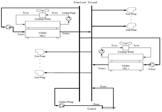 The commercial consumer considered in this research is a collection of responsive shopping centers, which are the components of the commercial aggregator. HVAC systems are among the major consumers of electrical energy in the commercial sector, especially in shopping centers. An HVAC system is a simple heating and cooling converter using water or a direct expansion system as a cooling method. HVAC systems’ pumps transfer hot or cold water to converters. Then, fans transfer the hot or cool air created in the converters to the desired building. In this section, we examine an HVAC system as a major consumer in a shopping center and model its main components mathematically. An HVAC system consists of three main parts: (1) pumps, (2) a cooling tower, and (3) an electric chiller system. The attached pumps are of the VFD (Variable Frequency Drive) type in this model. Figure 4 shows an example of an HVAC system.