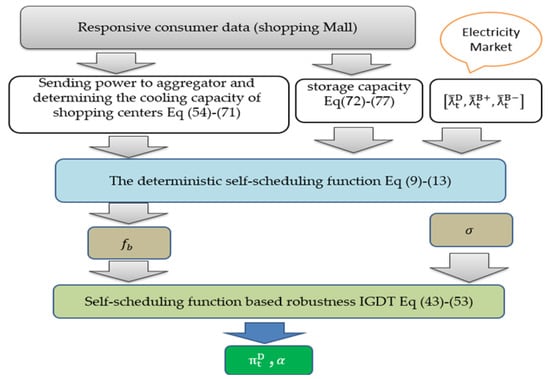 The steps of the operational optimization method of the commercial DRA based on the suggested IGDT method are shown in Figure 6. In the first step, the commercial aggregator’s power is determined using shopping center data and is proportional to both the cooling capacity (according to Equations (54) to (71)) and the storage power (according to Equations (72) to (77)). In the next step, the final cost of the aggregators is calculated using the predicted inputs and the values obtained from the previous step. Then, the critical cost of the aggregators ∆ is calculated using and σ. As explained earlier, ∆ is equivalent to the highest possible cost for the DRA. The output of the prior step is used to implement IGDT-based scheduling in the day-ahead energy market while considering all uncertainties.