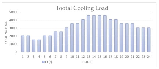 The parameter in Equation (54) denotes the total power consumption of shopping center C. In Equation (55), is the total power consumption of shopping center ventilation systems . In Equation (56), denotes the total power consumption of the main parts of the ventilation system (chillers, pumps, cooling tower, and electrical energy storage system). In Equation (57), taken from reference [38], represents the power consumption of the chiller system, which is proportional to the load cooling capacity . The regression coefficients () constitute a function of load cooling capacity and chiller consumed power. In Equation (58), is the consumed power of the cooling tower and is a function of the rated power of the cooling tower pump and the air flow rate . In Equation (59), represents the consumed power of the cooling tower, which is a function of the rated power of the cooling tower fan and the water flow rate . Equation (60) provides the total power consumption of the cooling tower. In Equation (61), denotes the pumps’ power consumption, which is a function of the pumps’ rated power consumption and the water flow rate , which are dependent on the frequency of the motors.