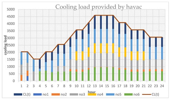 Equation (62) shows the maximum and minimum bounds of the air flow rate from the cooling tower. The maximum and minimum bounds of the water flow rate from the cooling tower are given in Equation (63). Equation (64) states the maximum and minimum bounds of the pumps’ water flow rate. Equation (65) describes the adjustable level of power consumption based on the third power of the frequency. In addition, Equation (66) expresses the upper and lower bounds of the set frequency. Finally, the cooling load balance at time t is stated in Equation (67). The total cooling capacity provided by the ventilation systems must be greater than the total cooling load of the system at time t. is determined according to the ventilation system’s temperature and rated capacity. Equation (68) yields the chiller’s part load ratio (Ω). According to the manufacturer’s recommendation, the lower limit of the chillers in operating mode should not be less than 30% (Equation (69)). Equation (70) shows the chillers’ binary coefficient for minimum cooling, representing the on and off states as 1 and 0, respectively. Equation (71) denotes the total cooling load adjusted based on a coefficient of the nominal cooling capacity of the chillers and proportional to the temperature and electricity prices.