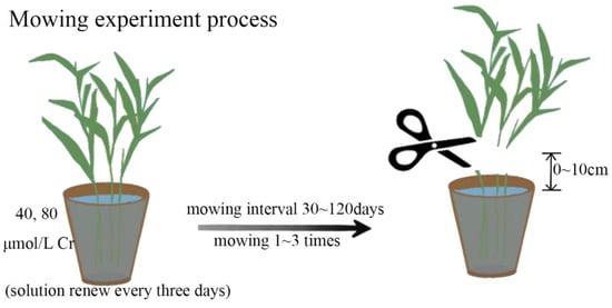 The 40 μmol/L (representing low chromium pollution environment) and 80 umol/L potassium dichromate solution (K2Cr2O7) were mixed in Hoagland solution to Cr treatmennt on L.hexandra (Figure 1). The nutrient solution with Cr treatments was renewed every three days. After 30 days of Cr treatment, the shoots of the plant were mowed at 0 cm (H0), 5 cm (H5), and 10 cm (H10) above the culture solution with scissors, with no mowing as control. This mowing method is modified from the one described in [23,36]. The root was left intact to allow for the re-growth of shoots. After the re-growth of shoots over the following 30 days, the shoots of L. hexandra were mowed as described above. All mowed shoots were used for biomass and Cr concentration measurement. Each treatment was performed in triplicates and the averages were recorded; the same is true below.