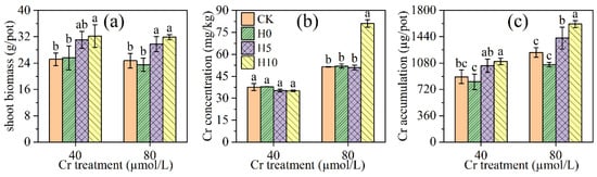 The effects of different mowing heights on the shoot biomass of L. hexandra are shown in Figure 2a. The biomass of the 10 cm (H10) mowing height was higher than no mowing (CK) at low Cr treatment (40 μmol/L), increasing by 28.2% (p < 0.05). However, there was no significant difference between the 0 cm (H0), 5 cm (H5) mowing height, and CK at low Cr treatment. The shoot biomass with H5 and H10 was significantly higher than CK at high Cr treatment (80 μmol/L), increasing by 20.3 % and 28.9 % (p < 0.05), while the difference in biomass between H0 and CK were not significant.