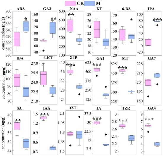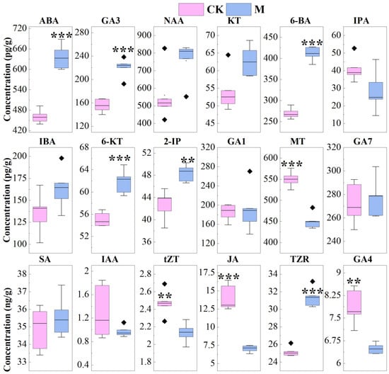 Figure 5. The contents of 18 phytohormones in leaves of Leersia hexandra Swartz. M represents proper mowing treatment, and CK represents the control (no mowing). Boxes include the 25th to 75th percentiles, horizontal lines within boxes represent median values, horizontal lines outside of boxes represent maximum and minimum values, and black ◇ represent outliers.** p < 0.01, and *** p < 0.001 represents significant differences between two treatments, respectively; the absence of labeling represents no significant difference between two treatments.