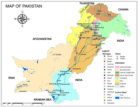 Pakistan is a country in southern Asia that has borders with Afghanistan, India, and China (Figure 1). The Himalayas and the Karakoram are located in eastern Pakistan. There are mountain ranges in the north (Hindukush), hills in the northwest, and a highland plateau in Baluchistan. There is a wide range in the average rainfall, from arid to semiarid, across Pakistan [17]. The Indus River is Pakistan’s most important waterway; it originates in the northern Karakorum Mountains, meanders its way south, and empties into the Arabian Sea. Pakistan’s agricultural sector is vital to the nation’s economy. Wheat, maize, rice, cotton, and sugarcane are the most common agricultural products, and they are grown in 27% of the total area. Increasing the agricultural yield is a common practice to meet the needs of a growing population. Industrial powerhouses such as the textile, pesticide, and fertilizer sectors may be found in the urban hubs of Pakistan [4]. Pakistan has two major river systems: those that flow into the Arabian Sea and those that flow into the Endorheic River basin. The former includes the Indus River basin, the Lyari river, and the Hingol and Hub rivers. The latter includes Mashkal, the Siastan Basin, and the Indus Plain [17]. The Indus Basin, the Kharan Desert system, and Makran coastal drainage make up Pakistan’s three hydrological groups. The Indus Basin is where the majority of surface and groundwater resources are found. Few inter-basin diversions are technically or economically viable due to Pakistan’s topography [18]. The overall water resource quantity is relatively unclear due to a lack of water data (particularly in Balochistan, where the hydrology is very unpredictable) and a lack of solid water accountancy, resulting in only estimated resources. Furthermore, surface groundwater fluxes are poorly measured [18].