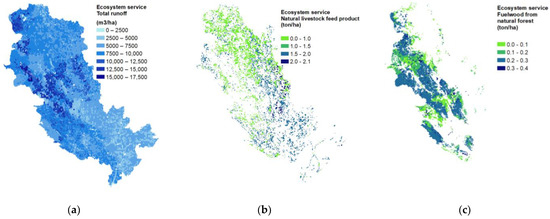 Provisioning service for Day Basin during 2003–2013 for (a) HESS1: Total runoff (m3/ha/y); (b) HESS3: Natural livestock feed production (ton/ha/y); (c) HESS4: Fuelwood from the forest (ton/ha/y).
