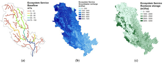 The attenuation of peak flow (i.e., HESS10) mainly follows the partitioning between infiltration and runoff by means of overland flow (Figure 4f). First, the SWAT model was executed with bare soil conditions to define the hydrograph statistics under reference conditions with an emphasis on daily peak flows. The reduction of these peak flow events was determined after running SWAT again with current land use practices. It is witnessed that natural landscapes such as forests and wetlands provide a wealth of regulating ecosystem services in detaining excess rainfall and, therefore, delaying peak flows. The average reduction of peak flow varies between 5 to 10%. An upstream-to-downstream accumulation is visible in Figure 4f; the lower part of the Day Basin is getting less susceptible to peak flows (15 to 20% reduction of natural peak flows). The role of forests in reducing peak flow has also been marked by others [78]. The average peak flow attenuation due to the current land use is 5.1%.