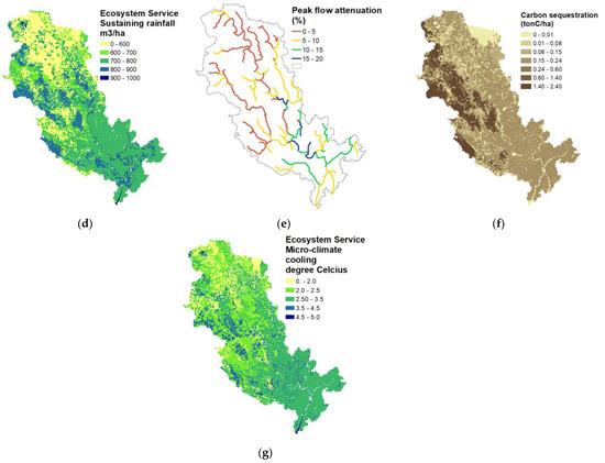 Regulating services for Day Basin with average value during 2003–2013 for (a) HESS5: Dry season flow or baseflow (m3/ha); (b) HESS6: Groundwater recharge (m3/ha); (c) HESS8: Root zone storage (m3/ha); (d) HESS9: Sustaining rainfall (m3/ha); (e) HESS10: Peak flow attenuation (%); (f) HESS11: Carbon sequestration (ton C/ha); (g) HESS13: Microclimate cooling (degree Celsius).