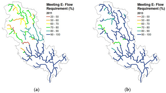 The satisfaction of meeting environmental flow, i.e., HESS16 for a dry (2011) and wet year (2013), is illustrated in Figure 5. For every reach, the longer-term river flow was computed from SWAT, and the environmental flow was defined as 29% of the annual volume. The dry season flow in the six-month dry period in each year was compared against the environmental flow (e-flow), indicating whether it satisfied the threshold amount () or not (). There is a clear-cut effect of wet and dry years on meeting the environmental flow (e-flow) requirement. While in the dry 2011, e-flow ranged from 20–80% in most upstream river stretches, this increased to nearly 80–100% in the wet year of 2013. In general terms, the lower delta in the Southeast better meets the environmental flows because the hydrograph responds to a larger catchment area where most variations in discharge are averaged out. The environmental flow satisfaction is 82% and 95% in a dry and wet rainfall year, respectively.
