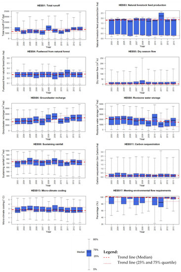 Boxplot values of ecosystem services for Day Basin from 2003–2013 and yearly average with median, quantile (5%, 95%), and quartile (25% and 75%). The dashed and dotted red lines show a trend line through the median, 25%, and 75% quartile, respectively.