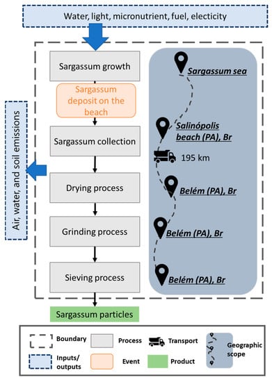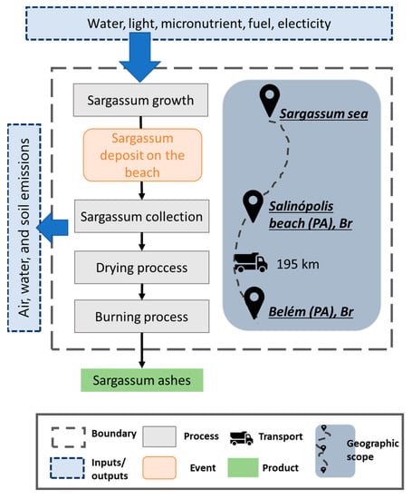 Regarding the geographical scope of the LCI data, the chemical analyses of the collected Sargassum samples were used to estimate the consumption of resources and the rate of emission according to stoichiometric analyses, secondary inventory data, and previous LCA studies conducted in these and other types of algae in order to fill the potential data gap in our object of study. Thus, the data collected for this study are a combination of regional primary and European secondary data, obtained from the chemical analyses of the collected Sargassum algae and from LCI databases, such as Ecoinvent 3.8.