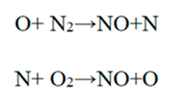 According to Hayhurst and Vince (1980) [35], the type of fuel has no influence on the formation of pollutant gas NO, but rather the concentration of O2 in the system and the temperature of the burning flame. According to the same authors, the reaction mechanism involves the set of chemical reactions presented in Figure 6.
