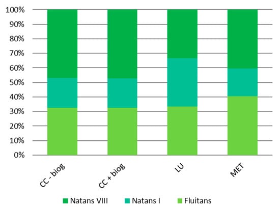 The theoretical results obtained for the reference scenario show that, regarding the indicators of climate change, the species S. natans VIII has higher emission potential—almost corresponding to the sum of emissions of other species—followed by the species fluitans.