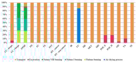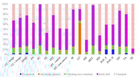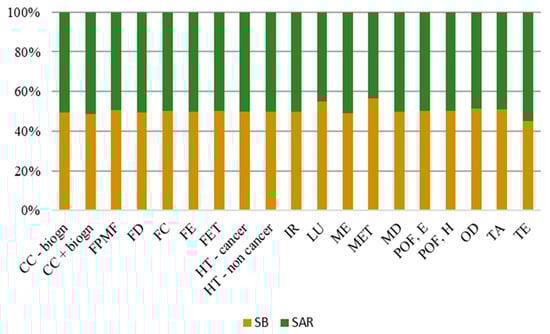 Figure 15 shows that the production of sugarcane bagasse (SB) and Sargassum algae (SAR) particles presents similar values of environmental potential impact for all categories of impact, with slightly lower values to SAR particles. The percentage values of potential impact are in the range between 45.1% and 56.6% for SB particles and between 43.4% and 54.9% for SAR particles. Despite the range of similar values, the potential impact related to transport is higher for SB particles, mainly due to the large distance between the sugarcane plant and Belém, where processing takes place. Nonetheless, the potential impact values of SAR particles are similar to the SB values due to the excavation impact considered in the algae process.
