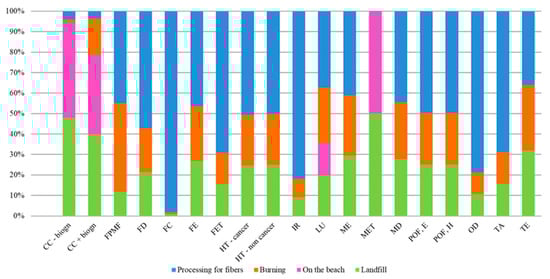 It is important to note that, for the reference scenario in which the natural decomposition of Sargassum algae on the beach was considered, only four of the indicators (out of the 18 evaluated) herein shown presented potential for impact, without contribution to other categories.