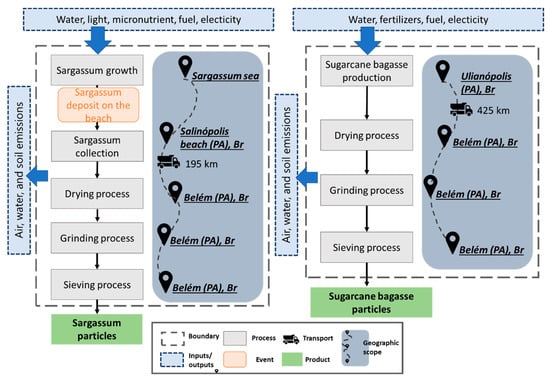 In the scenarios presented for each particle production, the same processes are presented: drying, cutting, and sieving. In these processes, energy consumption stands out, which was based on equipment used on a laboratory scale for processing. The drying processing of 1 kg of Sargassum algae generates 0.15 kg of particles, which was then considered a functional unit. The functional unit of 0.15 kg was adopted for sugarcane bagasse particles (SB) for comparison; however, according to Driemeier et al. (2018) [39], in the sugar–alcohol industry, sugarcane bagasse comes out of processing with approximately 50% moisture, so the entry of 0.3 kg of SB was considered before drying.
