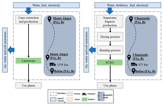 The functional unit is one kilogram of inert material, and the geographic scope of SBA and limestone are presented along with the boundary of the systems in Figure 16.