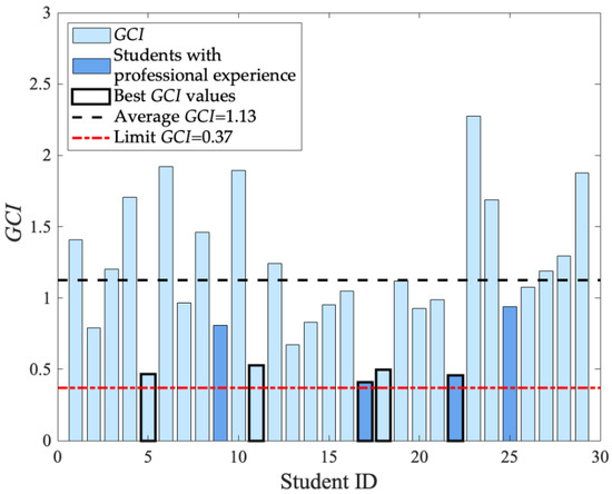 Significant differences were found between those students with and without experience in the construction sector, according to Mood [33] test (significance level α = 5%). Students with previous experience in the construction sector (students #9, #17, #22 and #25 highlighted in darker blue in Figure 1) were more consistent (average GCI = 0.65) when compared to those without experience (average GCI = 1.20).