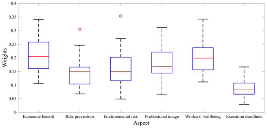 The highest weight and lowest variability corresponded to economic benefit, while the lowest weight was obtained by execution deadlines. Risk prevention obtained the second-lowest weight with a high variability, while environmental risk was the aspect with the highest variability; this finding indicates that some surveys presented very low weights (10% of the surveys with w3 < 0.10). Workers’ wellbeing rated as the second-highest aspect and professional image presented the third-highest weight. These results are further discussed in the following sections.