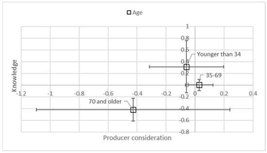 Younger respondents (<34 years old and 35–69 years old) tended to have a more positive producer consideration regression value than older respondents (>70 years old) (Figure 6). The oldest age group’s regression value was more negative than the younger age group in knowledge and importance awareness factors, but more positive in producer contribution and collection cooperation factors.