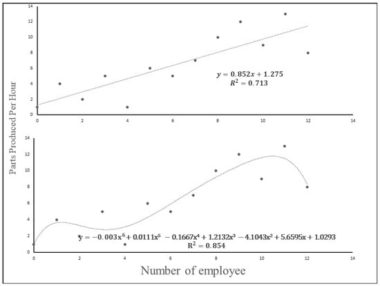 Figure 5 shows two different curve fittings, where the coefficient of determination (R2) allows us to evaluate how well it fits the data, that is, the goodness of fit. The curve on the left has a coefficient of 0.71 and the one on the right of 0.85.