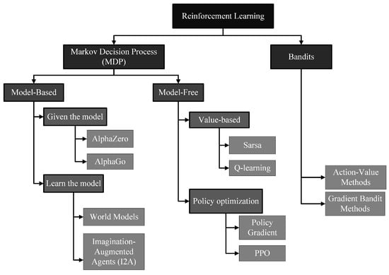 - Zhang, H.; Yu, T. Taxonomy of reinforcement learning algorithms. In Deep Reinforcement Learning; Springer: Singapore, 2020; pp. 125–133. [Google Scholar]