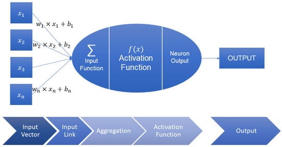 Deep learning (DL) is a form of artificial intelligence. These methods take their name from the architecture of neural network algorithms. The neuron is the basic unit that makes up an artificial neural network (ANN), as demonstrated in Figure 9 [15]. The simple neuron, more formally the perceptron algorithm, takes a vector as input, as shown in the supervised learning example. These values are multiplied by their respective weights and aggregated by the input functions, then an activation function is applied to produce an output result.