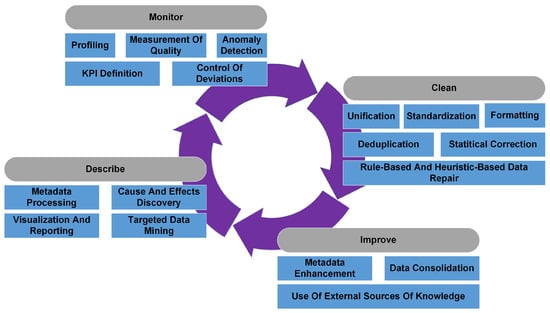 Data quality is an important issue for data-driven modeling. For example, a case study applied to the reliability of mining equipment shows that raw data are often erroneous, lacking detail and accuracy, and, therefore, not suitable for decision-making. The study reveals that different fields of relational databases show errors in assigning maintenance tasks to the right subsystem, assigning codes to describe the type of work, associating the right type of maintenance (condition-based, preventive, corrective), etc. [22]. Cleaning must be performed so that the data are exploited to produce valuable insights for decision makers. In an ideal context, it is preferable that entry errors be prevented rather than corrected downstream. In fact, since the variance in data quality is greatly influenced by the user who enters it, it is essential to develop better management of the workers who interact with the database. Organizations must consider the effect of time pressure on data entry and provide feedback from supervisory staff to operators. In addition, it is necessary to encourage the participation of operators and to value their work toward data entry, in order to improve its quality [23]. Nonetheless, data scientists must ensure quality throughout the modeling and cleaning still needs to be performed. The data cleaning process involves the detection of errors and the removal or replacement in the dataset [24,25]. Figure 11 summarizes a methodology to quantify data quality (diagnostic) and manage its quality (correction) through a continuous process [24].