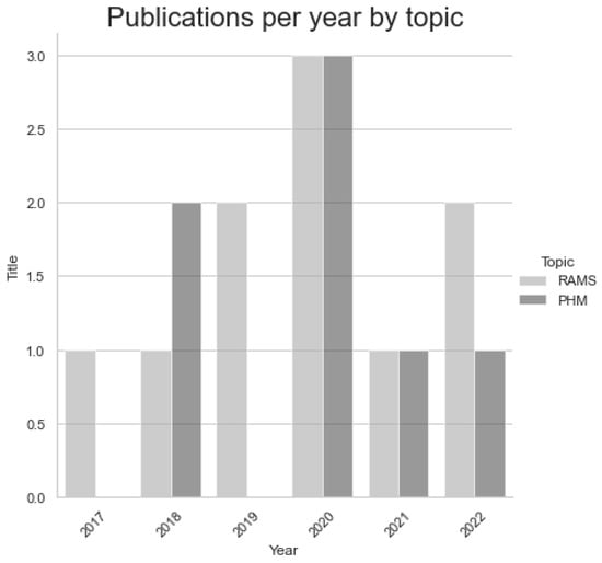 As mentioned earlier, RAMS is a framework for evaluating and optimizing the performance of a system, focusing on the general characteristics of a population, while PHM is a more proactive approach that involves continuously monitoring a system to predict and prevent potential failures. We classified each article and its application according to these definitions. Figure 12 shows the distribution of publications each year, by the subject of application. We notice that the number of publications per subject is quite similar for RAMS and PHM, with small variations over the years. We also notice that there is a strong increase in the overall number of publications in 2020, which corresponds to the outbreak of the pandemic, and then a significant decrease the following year.