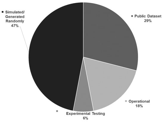 As shown in Figure 14, 47% of the studies use simulated data or data that are generated randomly by theoretical mathematical functions. Then, 29% of the publications used public datasets; these data are freely available to the public for different uses. A large proportion of public datasets are actual operational data. However, their treatment is simplified compared to a real case study, and their use is mainly intended to test and compare new approaches with existing methods. Many organizations make their data available to the public on a platform such as Google Dataset Search or Kaggle. For example, in [32], they used data from NASA’s Turbofan engine degradation simulation [33] to compare the new RNN architecture for the estimation of the remaining useful life. In [34], they used NASA’s experimental data on lithium-ion batteries to test a new CNN-LSTM architecture to improve the precision of the prediction of remaining useful life [35]. Less than a quarter of the study are interested in the analysis of industrial case studies (6%) through experimental testing and operational data (18%).