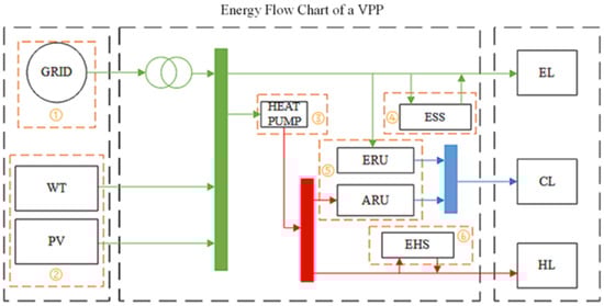 It is necessary to aggregate the operating status, operating cost and operating efficiency of DERs to participate in the power market together with traditional power plants, such as thermal and hydro power plants. Therefore, VPP, the exchange of internal resources with the external grid, can sell electricity to customers and participate in electricity markets, responding to demand-side management measures such as time-of-use tariffs for external loads [5,6].