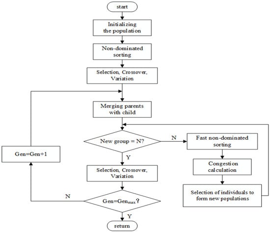 Figure 3 indicates the NSGA-II algorithm flowchart, which is divided into three main parts. The first part is the initial definition. Firstly, the population is initialized. The number of objective functions and the population size are determined. Additionally, non-dominated sorting is then performed to determine the number of dominated individuals and the set of dominated solutions of known individuals. The diversity of individuals in the population is preserved by selection, crossover and variation. The second part is the elite selection. The number of new populations after the parent–child merger is determined. Then, the screened individuals are sorted quickly in non-dominated. They are screened according to the calculated crowding. The third part is the iteration, where the offspring are selected, crossed and mutated until the number of iterations is reached.