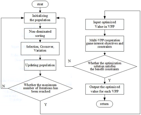When the VPPm was optimized separately, the cost models of PV, WT, and ESS were established. Considering DR, the VPP optimal operation model was established. The solution flow chart is shown in Figure 2. All the participating subjects were formed into a grand alliance, and the strategy was the scheduling result of each equipment. The cost that should be saved was obtained by comparing the cooperative or non-cooperative solutions in the minor alliance. Then, benefits were distributed to the major alliance after searching for feasible minor alliance solutions.