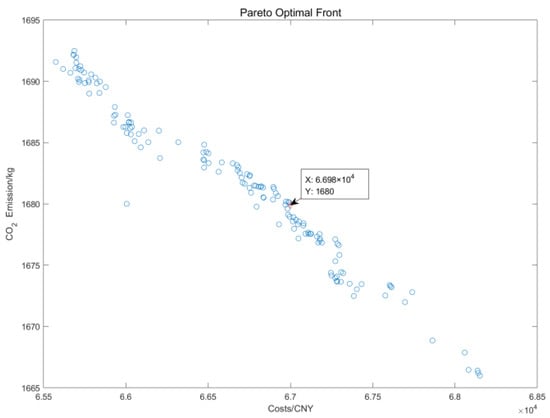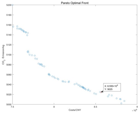 From Figure 5, it can be concluded that the lowest cost and the lowest CO2 emissions were mutually exclusive objectives. The reduction in one side must be accompanied by the increase in the other side. Therefore, this paper used the TOPSIS method [33,34,35] to find the relative optimal solution, as shown in the marked points in Figure 5.