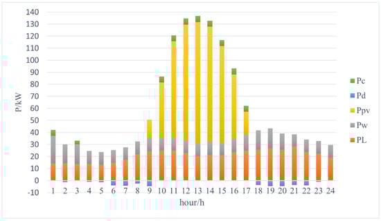 where F is the total operational cost of the system; denotes the PV operating state at time t, with a value of 0 or 1; denotes the ESS operating state at time t, with a value of 0 or 1; denotes the WT operating state at time t, with a value of 0 or 1; denotes the interruption of the flexible load at time t with a value of 0 or 1. The formula is the cumulative minimum value of each cost of the virtual plant at 24 h of the day.