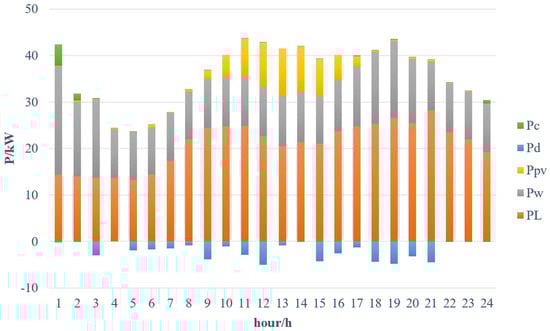 From Figure 6, the optimized power curve was obtained. From the curve above, it can be found that the net profit of each VPP in five periods, 23:00–0:00, 0:00–1:00, 1:00–2:00, 2:00–3:00 and 3:00–4:00, was less than that of other periods, while in three periods of 11:00–12:00, 12:00–13:00 and 19:00–20:00, the net profit of each VPP was more than that of other periods. ESS was mainly charged from 10:00 to 17:00 and discharged from 6:00 to 9:00 and 18:00 to 22:00, to maintain the normal operation of the VPP.