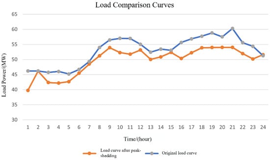Meanwhile, the improved load curve obtained from the load power curve was compared with the original load curve, as shown in Figure 10. From Figure 10, it was seen that the DR-oriented VPP could effectively shave the peak. The peak of the original load curve was 60.278 MW, while the peak of the VPP was 54.019 MW after shaving the peak and filling the valley. It achieved 10.1% of the peak load of the VPP, and the accuracy of load regulation in the VPP reached 12% of the total capacity of the VPP.