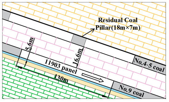 Among these, the coal seams studied in descending order from shallow to deep are No. 4, No. 5, and No. 9. As shown in Figure 2, the No. 4 and No. 5 coal seams have a high degree of coalescence, with an average coal thickness of 7.08 m, a simple structure and a relatively stable coal seam. The roof lithology is dominated by siltstone, and the floor is siltstone. The No. 9 coal seam is 16.6 m away from the No. 5 coal seam and its thickness is 5.6 m, the floor and roof are siltstone, the thickness of the whole coal is stable and belongs to a stable coal bed group, and there is no single super-thick hard sandstone layer in the upper part. However, due to the existence of several groups of mixed sandstone groups, the suspended roof may be easily formed in the mining process of the panel, resulting in stress concentration, elastic accumulation and abnormal pressure behavior. The 11903 panel of the buried depth of the No. 9 coal seam is 342~378 m. The inclined length is 130 m and the top is the residual coal pillar of the No. 4–5 coal seam with a width of 18 m. The pressure frame accident that occurred in this panel occurred during mining.