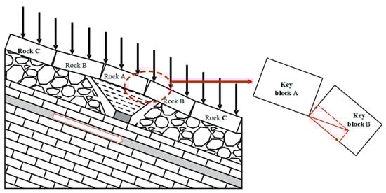 As shown in Figure 3, the basic roof above the coal pillar breaks to form a hinged structure composed of three key blocks, A, B, and C, which support the weight of the upper strata and maintains overall stability when it is in equilibrium. The stability of key block B needs to meet specific mechanical conditions: when the friction force between key blocks A and B is greater than the shear force between them, the slip motion will not occur between them and key block B will not lose stability; and when the positive pressure between key blocks A and B is greater than the compressive strength of the key block, rotational instability will also not occur between them. When the lower coal seam is mined, the subsidence of the coal pillar increases the force between key blocks A and B, and when key block B meets the mechanical conditions of instability, rotary subsidence movement occurs and drives the movement and collapse of the upper strata. The stress is then transmitted downwards through the coal pillar, resulting in deformation of the support frame and other disasters in the lower panel.