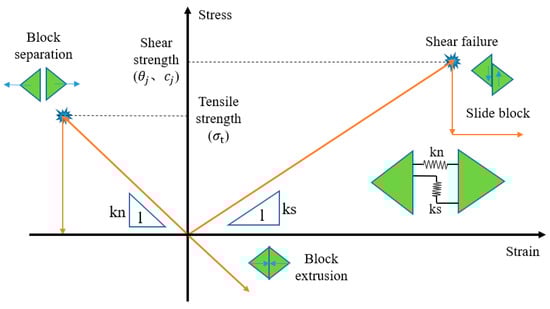 In this simulation, the elastic constitutive model is used for blocks and the coulomb slip model is used for contacts. As shown in Figure 4, the deformation and mechanical behaviors of the numerical model depend on the micromechanical parameters of the trigon blocks. In the normal and tangential direction of the contact surface, when the normal force or tangent direction does not exceed the strength, the mechanical response behavior is controlled by the normal stiffness and tangent stiffness; when the normal force or tangential force exceeds the strength, the contact surface demonstrates tensile failure or shear failure.