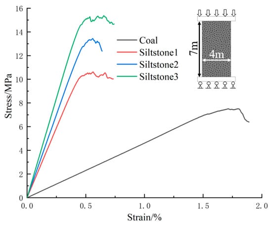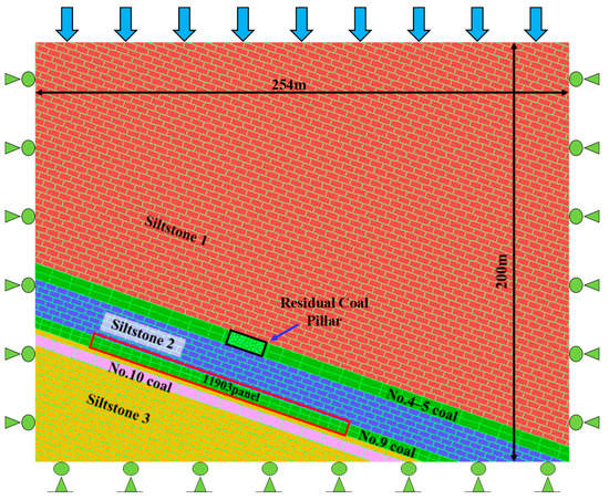 The size of the 2D model is 254 m wide × 200 m high, and the total number of blocks is 3074. For monitoring the damage and crack propagation of coal pillars, a total of 128 triangular blocks with dimensions of 18 m × 7.08 m were generated in the coal pillar area. Additionally, rectangular blocks and grid divisions were used in siltstone 1 and siltstone 2 to better study the movement of rock layers, stress distribution, and crack development. The maximum edge length of the triangular block 1.5 m and the size of the rectangular block is 6 m × 3 m; The upper coal seam was divided into rectangular blocks of 10 m × 3.04 m, except for the coal pillar area, while the lower coal seam was divided into rectangular blocks of 5 m × 2.8 m, in order to make the coal seam excavation more convenient. The left and right boundaries of the model are set with horizontal displacement constraints, while the bottom boundary is set with vertical displacement constraints. At the top of the model, stress boundaries are set, and a vertically downward load of 6.25 MPa is applied to simulate the pressure of overlying strata.