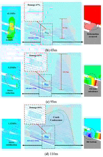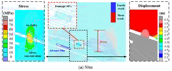 In the early stage of excavation, the development of cracks, stress, and displacement in the coal pillars and surrounding rock mass is relatively small until it approaches the stress concentration zone under the residual coal pillar, where significant changes begin to occur in all indicators. The process continues until the coal pillar area is excavated and the model is re-balanced, with an advancing distance ranging from 50 m to 110 m. The changes in the cracks, stresses, and displacements in the model during this process are shown in Figure 7.
