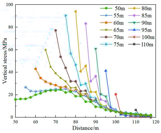 To understand the stress changes in the lower coal seam during the excavation process, measuring lines were placed in front of the excavation face to record the vertical stresses in the coal mass at different distances. The results are shown in Figure 8.