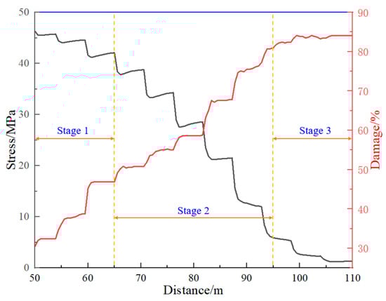 where NS is the number of shear cracks, Nt is the number of tensile cracks, NC is the total number of joints, N is the total number of cracks, and D is the damage parameter used in this study to characterize the degree of damage to the coal pillars. The monitoring results of stress and damage rate on the coal pillars are shown in Figure 9, corresponding to the spatiotemporal range from 50 m to 110 m.