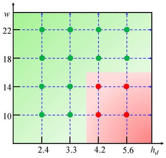 Based on the conclusion in the previous section, the end of the second stage (at a distance of 95 m) is the node at which the model enters a stable phase during the excavation process. The coalescence of the cracks on coal pillar overlying rock at the end of the second stage was taken as an indicator to differentiate between the results of each scheme. A coordinate system was established to represent the results, as shown in Figure 10. The red area indicates that the cracks have coalesced, while the green area means that they have not yet coalesced.