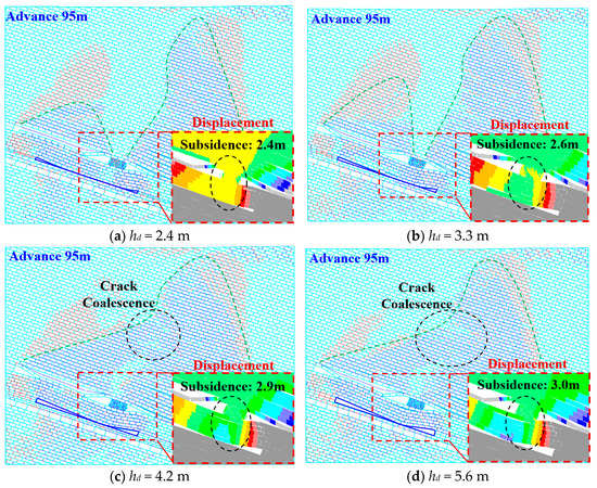 To study the mechanism by which the thickness of the lower coal seam affects the model, the results at the end of the second stage (95 m) for different thicknesses of the lower coal seam were selected for the same 14 m width of the coal pillar. A comparison was made between cracks and displacements, as shown in Figure 11.