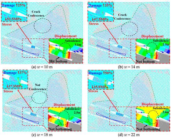 In the case of constant coal pillar height and interlayer rock mass thickness, different coal pillar widths and lower coal seam thicknesses were set to control the size of the two variables. Specifically, the coal pillar height was set at 7 m, based on geological conditions, while the width was set at 10 m, 14 m, 18 m, and 22 m. The interlayer rock mass thickness was set at 16.6 m according to the actual field situation, while the lower coal seam thickness was set at 2.4 m, 3.3 m, 4.2 m, and 5.6 m. There are a total of 16 schemes, and the excavation process sequence of the model is consistent for each scheme. Cracks, stress cloud maps, and displacement cloud maps were extracted according to the stages described in the previous section, and the legends used are the same as in the previous section.